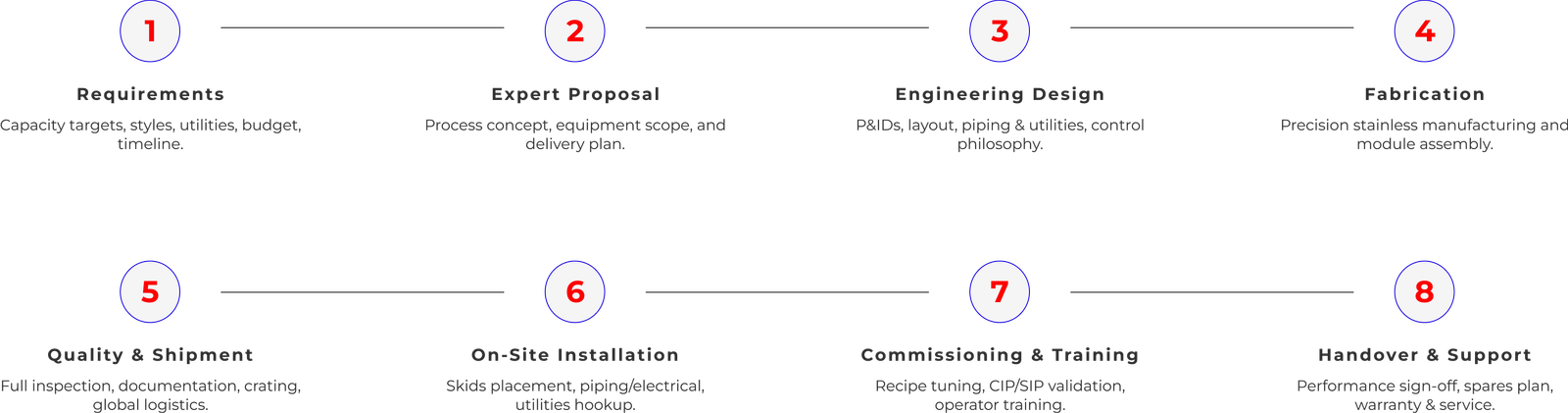 Trusted by leading brewery groups (e.g., Tsingtao, Budweiser, Krones, Carlsberg). We deliver full-plant solutions – design, fabrication, installation, commissioning, training, and energy-saving upgrades with complete systems integration.