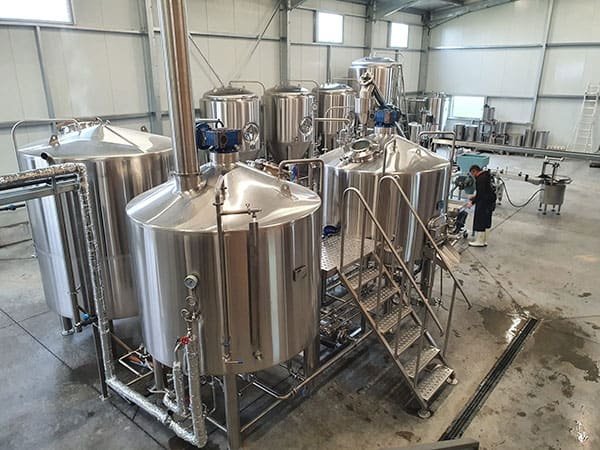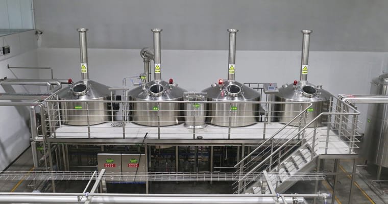 Brewhouse with an effective volume of 2000L, steam heating, four vessels. From right to left are Mash Tun, Lauter Tank, Brew Kettle, Whirlpool Tank. It can achieve continuous production of 5 brewing batches per day, with a daily output of up to 10000L.